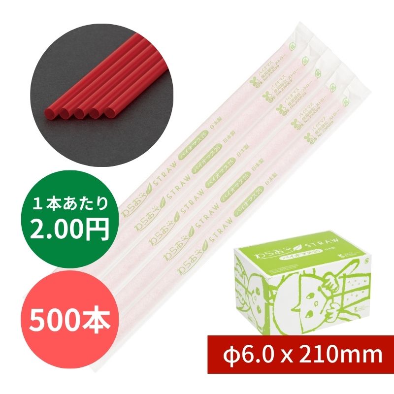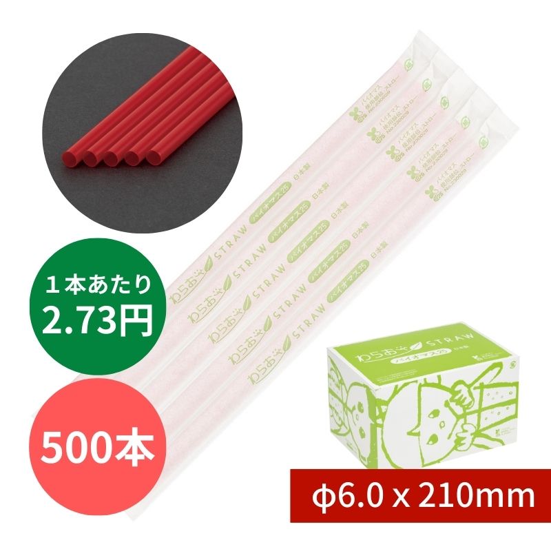 バイオマスストレートストロー №B464 φ6x210mm 500本入 赤 紙包装
