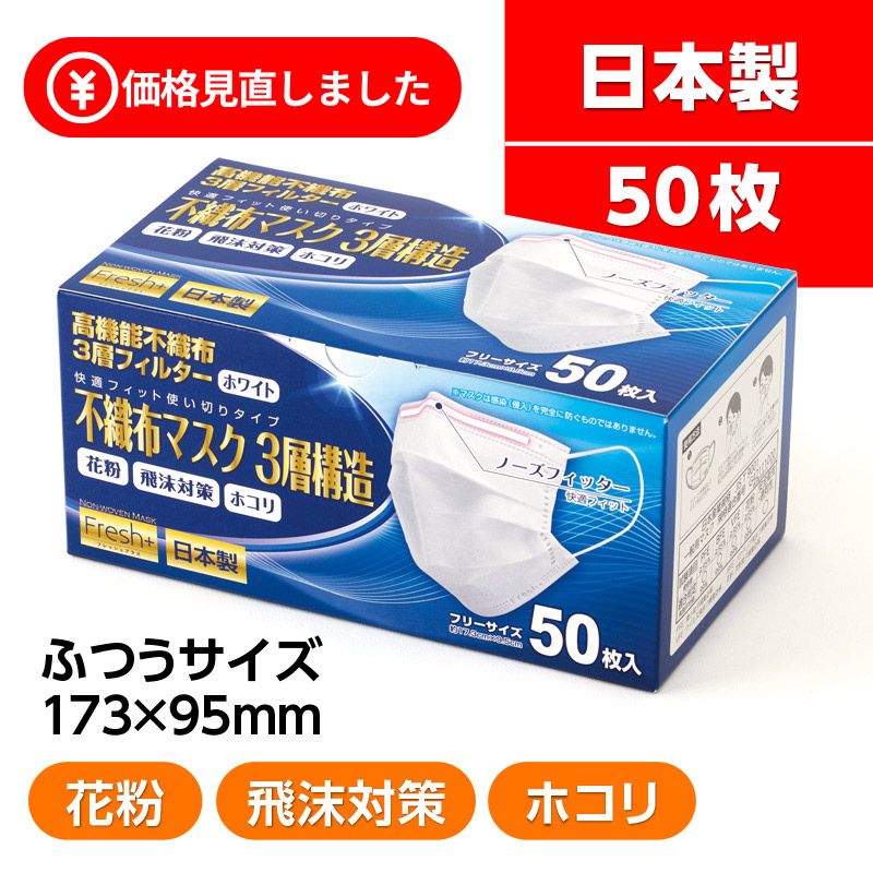 【価格見直し】フレッシュプラス 不織布マスク3層構造 国産