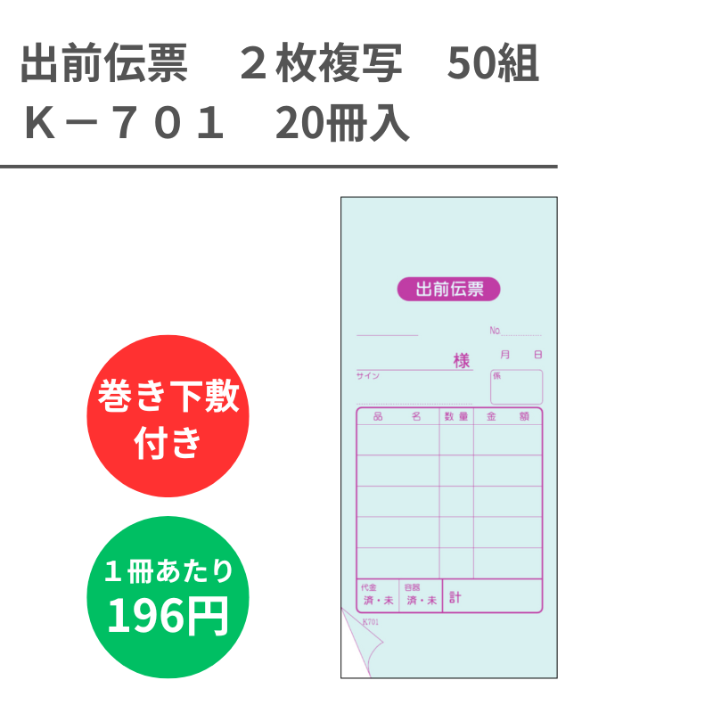 K-701 出前伝票 2枚複写x50組 20冊