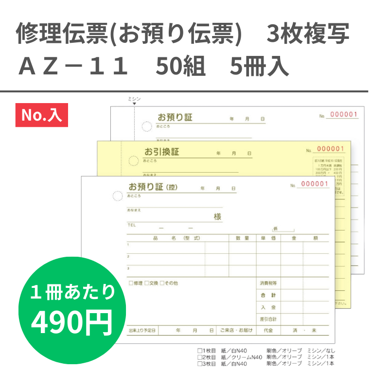 AZ-11 修理伝票(お預り伝票) 3枚複写x50組 5冊 №入り