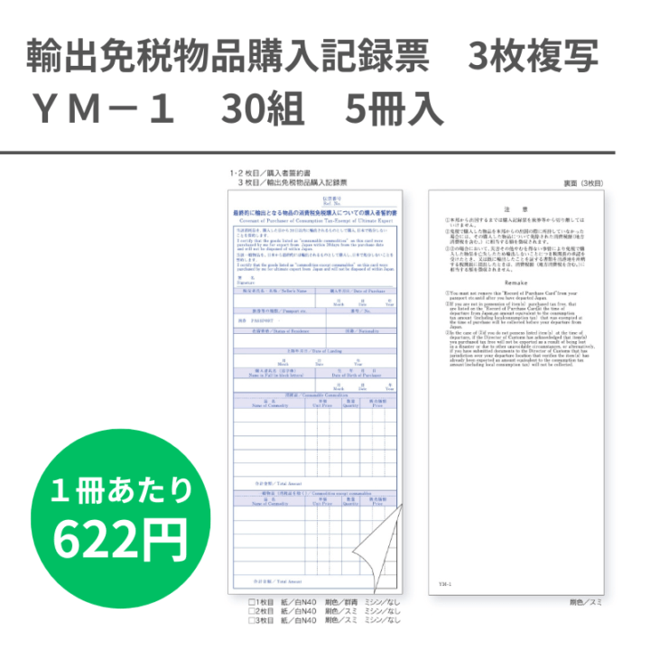 YM-1 輸出免税物品購入記録票 3枚複写x30組 5冊
