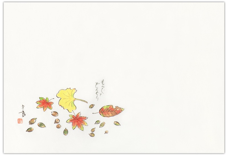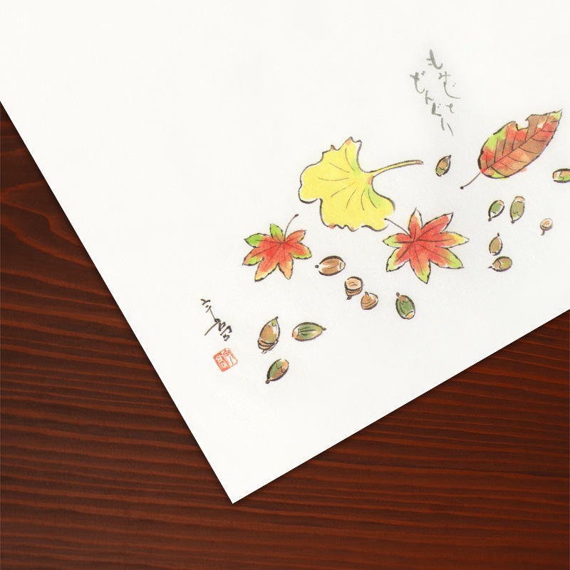 秋の景色を彩るモミジやイチョウ、ドングリを描いたテーブルマットです。