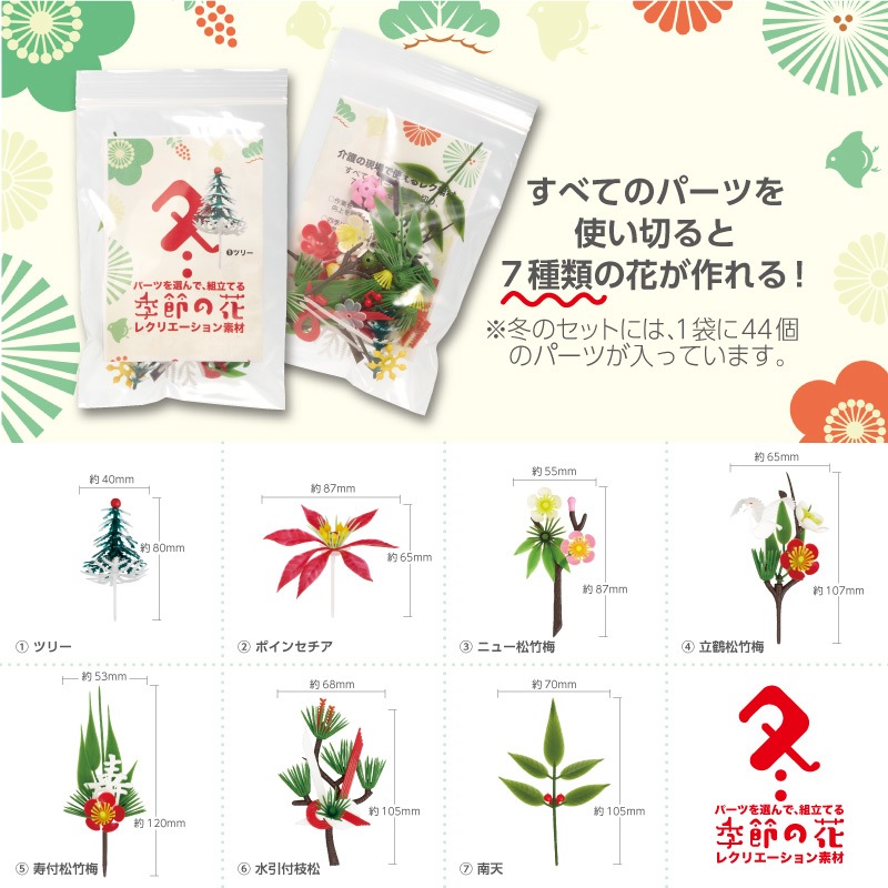1袋に44個のパーツが入っており、すべて使い切ると7種類の花が作れます。