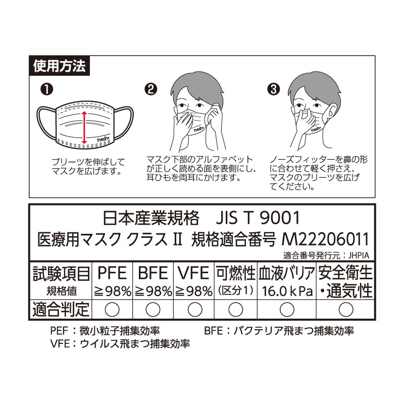 ●日本産業規格 JIS T 9001 医療用マスク クラス2に適合した不織布マスクです。