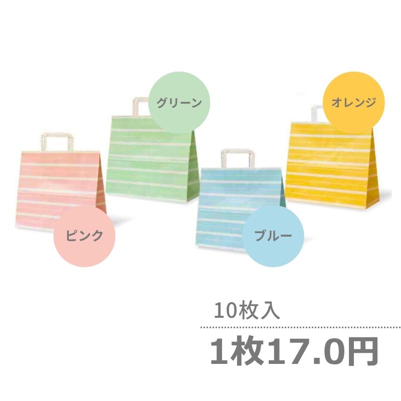 商品説明:カラフルな4色展開(ピンク・グリーン・ブルー・オレンジ)の紙製手提げ袋です。焼き菓子やギフトなどの持ち運びに適した小サイズ。明るく親しみやすいカラーとシンプルなデザインで、さまざまな用途にお使いいただけます。