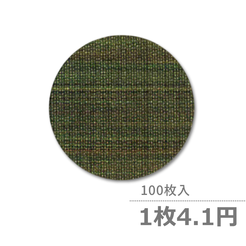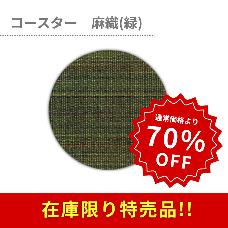 商品説明:紙製の丸型コースターです。表面は「麻織」柄の落ち着いた緑色で、さまざまなシーンに使えます。クッション紙を使用しており、テーブルやグラスにやさしい仕様です。