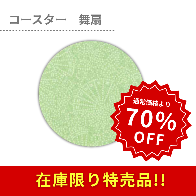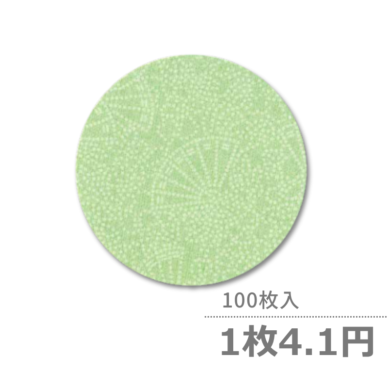 商品説明:紙製の丸型コースターです。爽やかな黄緑色の扇柄で、さまざまなシーンに使えます。クッション紙を使用しており、テーブルやグラスにやさしい仕様です。