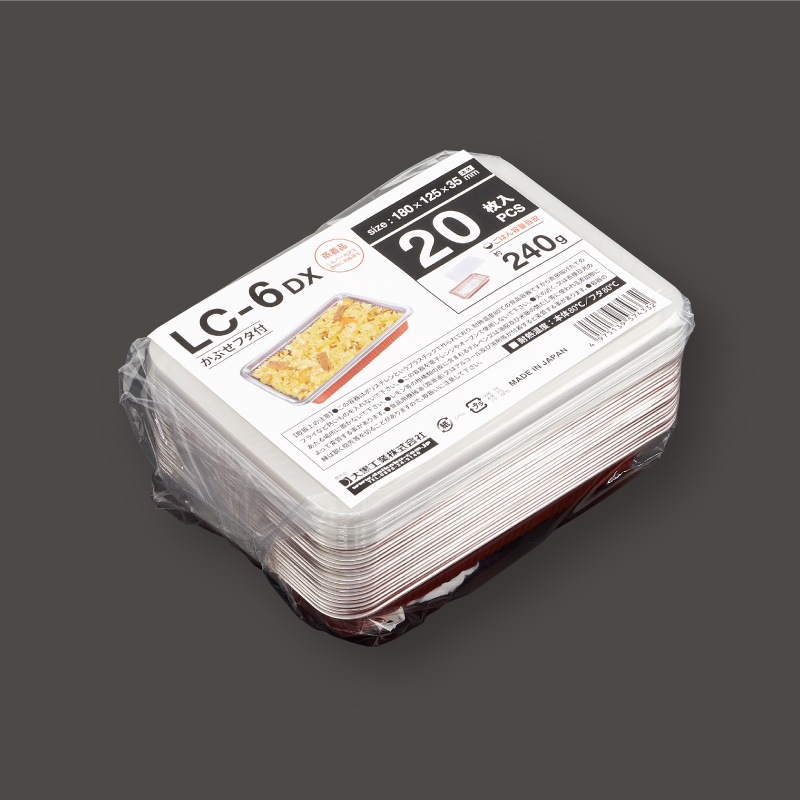 「LC-6DX かぶせフタ付」が少量パックになりました。テイクアウトやイベント用に最適です。必要な時に必要最小限を小ロットで購入できます。●サイズ:180x125x35mm●材質:PS●ごはん容量目安:約240g※電子レンジでは使用できません。