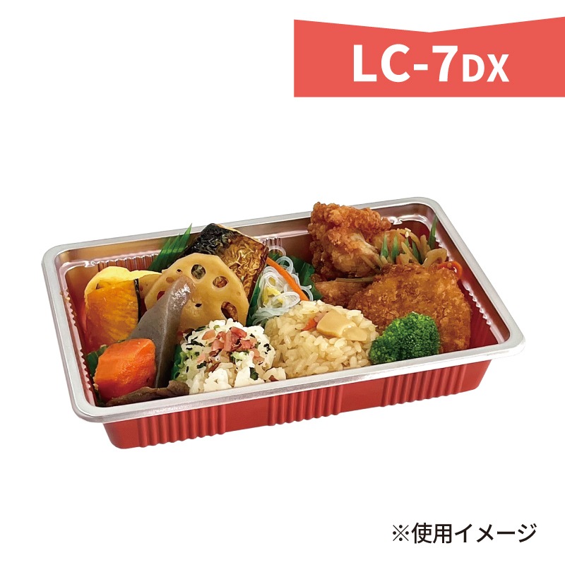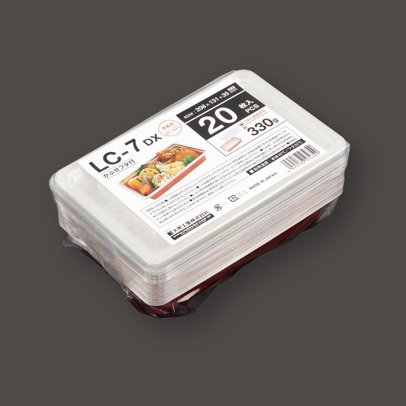 「LC-7DX かぶせフタ付」が少量パックになりました。テイクアウトやイベント用に最適です。必要な時に必要最小限を小ロットで購入できます。●サイズ:208x131x35mm●材質:PS●ごはん容量目安:約330g※電子レンジでは使用できません。