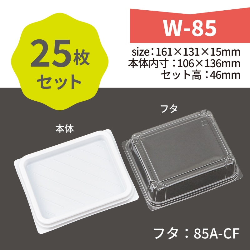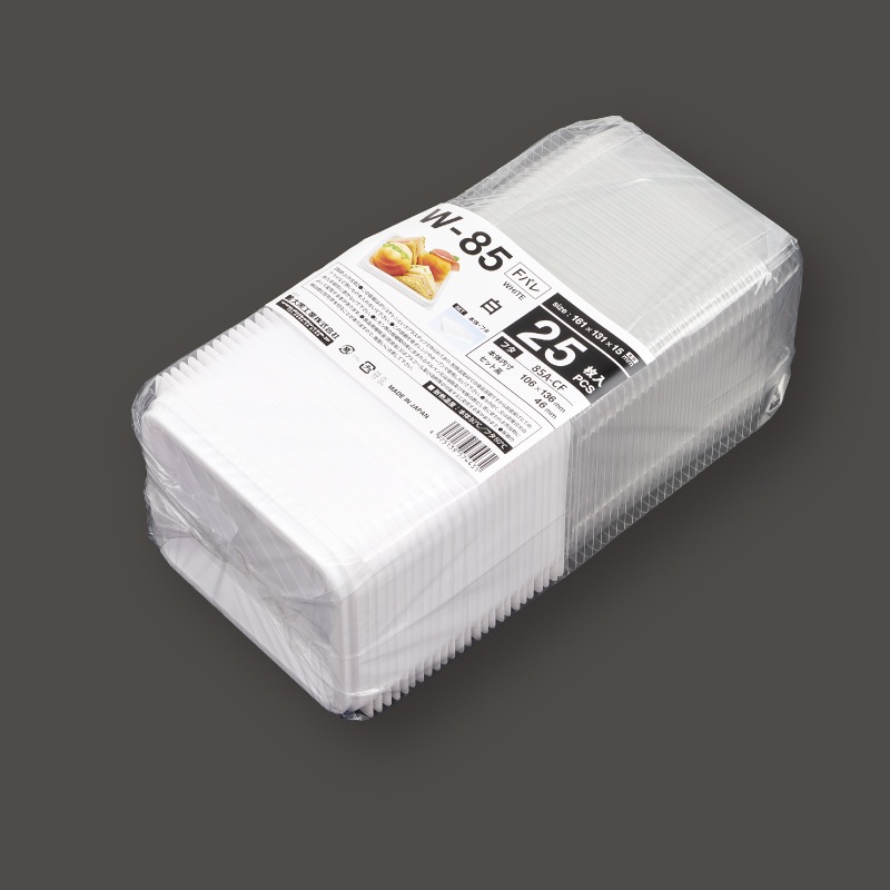 「FパレW-85白・85A」が少量パックになりました。テイクアウトやイベント用に最適です。必要な時に必要最小限を小ロットで購入できます。●サイズ:161x131x15mm(セット高:46mm)●材質:HIPS※電子レンジでは使用できません。
