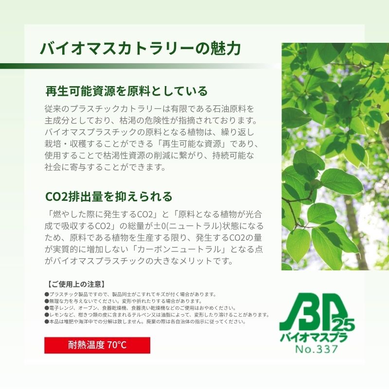 商品説明:植物由来の原料を25%以上配合したバイオマスプラスチックを使用石油資源の使用削減にも繋がる環境にやさしいカトラリー