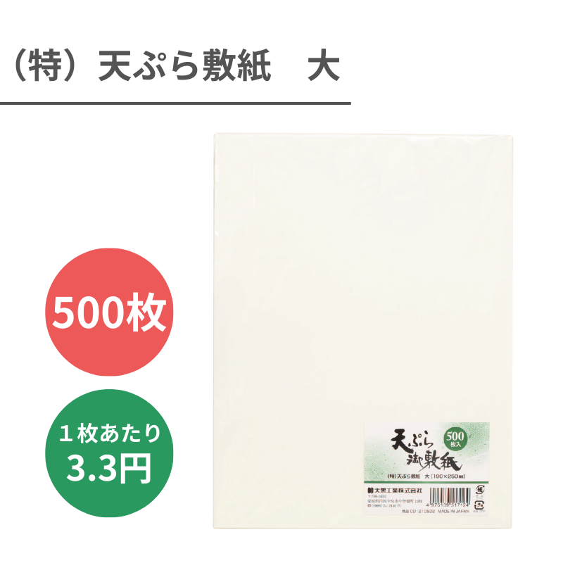 ・天ぷらや揚げ物の油をしっかり吸収し、料理の見た目をきれいに保つ使い捨て敷紙です。・清潔感のある盛り付けをサポートし、ご家庭はもちろん、テイクアウトやお惣菜のパック詰めにも最適。・使いやすいサイズで実用性も抜群です。