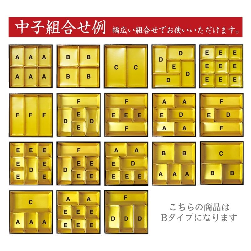 おせち重箱用の金ボール・仕切です。重箱のサイズとご希望の仕切方を確認いただきご注文ください。仕切は複数サイズがありますので、いろいろなパターンを組むことが可能です。