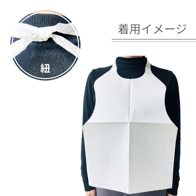 飲食の際などにご使用いただける、使い捨てタイプの紙エプロンです。無地でシーンを選ばず、業務用として幅広くご使用いただけます。首に掛け、背中側で紐を結んで装着するタイプです。