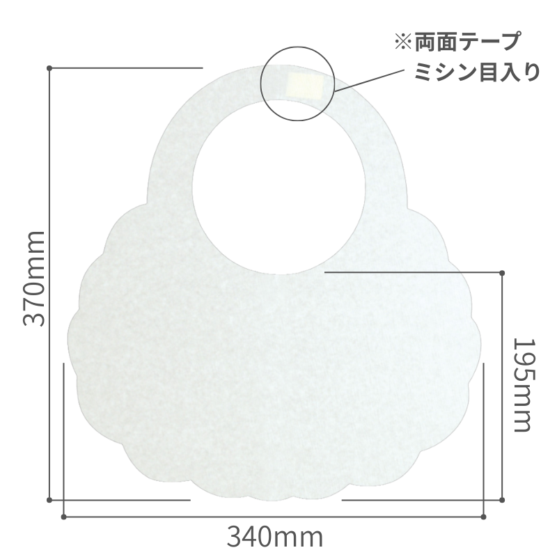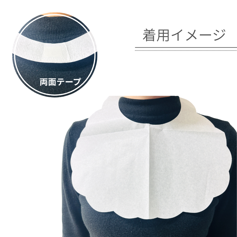 飲食の際などにご使用いただける、使い捨てタイプの紙エプロンです。無地でシーンを選ばず、業務用として幅広くご使用いただけます。首周りの輪の背面にミシン目が入っており、切り離した後、付属の両面テープで貼り付けて装着するタイプです。