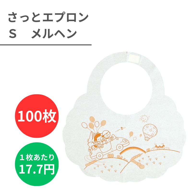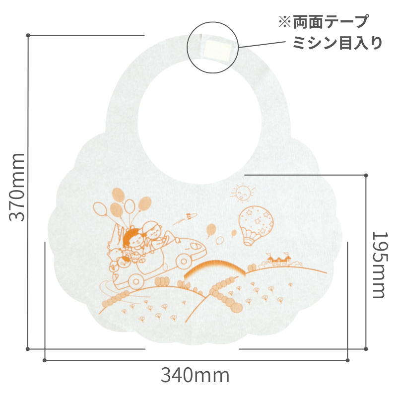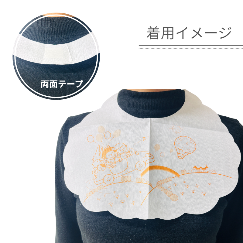 飲食の際などにご使用いただける、使い捨てタイプの紙エプロンです。かわいらしい柄入りデザインで、お子様向けにおすすめです。首周りの輪の背面にミシン目が入っており、切り離した後、付属の両面テープで貼り付けて装着するタイプです。