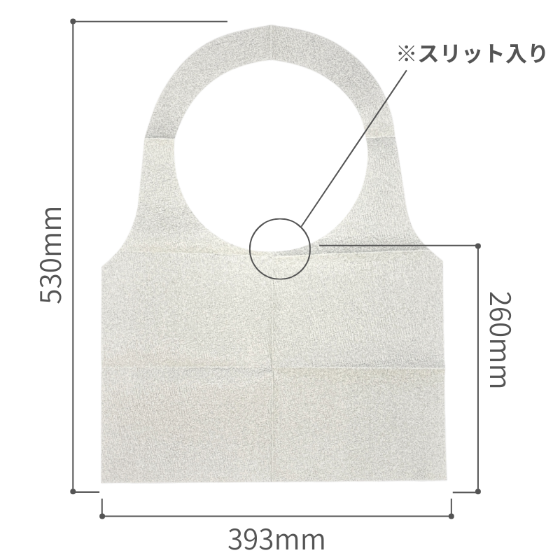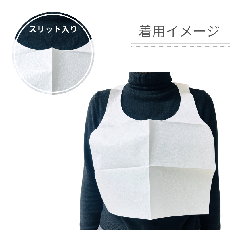 飲食の際などにご使用いただける、使い捨てタイプの紙エプロンです。無地でシーンを選ばず、業務用として幅広くご使用いただけます。輪になった首部分に、上から首を通すだけで装着できるタイプです。正面(胸付近)にスリットが入っています。