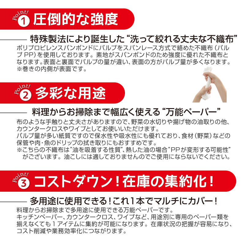 ・パルプの量も多く保水性や吸水性にも優れているため、食材(野菜)などの保管や肉・魚のドリップの拭き取りにもおすすめです。